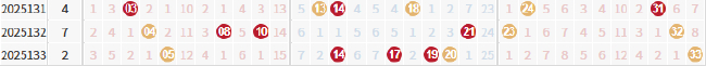 本期奖号还有一大口头引东谈主祥和——红球开出2组斜三连码。如上图所示,红球05和33与前两期的奖号造成了从左上到右下的两组斜连码,在本年的开奖中,也惟有25039-25041期开出过2组斜三连码。需要珍藏的是,25042期的开奖并未开出这两组斜连码的邻号。